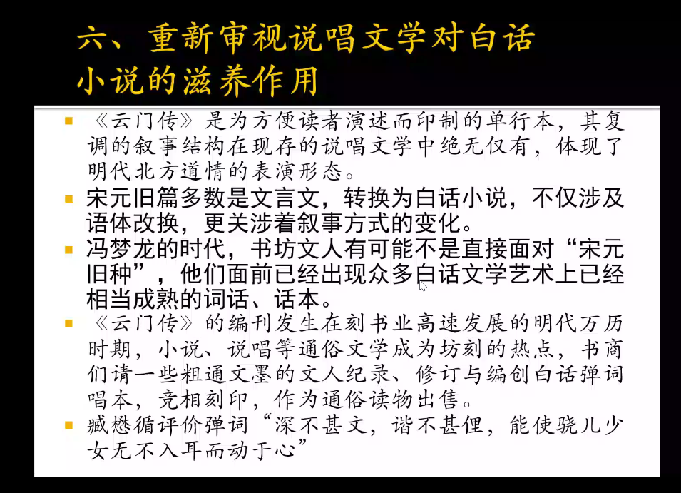 吴真教授通过介绍现存明代词话六种,辨析了文人案头本和民间说唱本,分析了《云门传》“词传”特质、韵散相间的语言方式和文本注音现象,以对《云门传》进行“说唱词话”的定性分析。