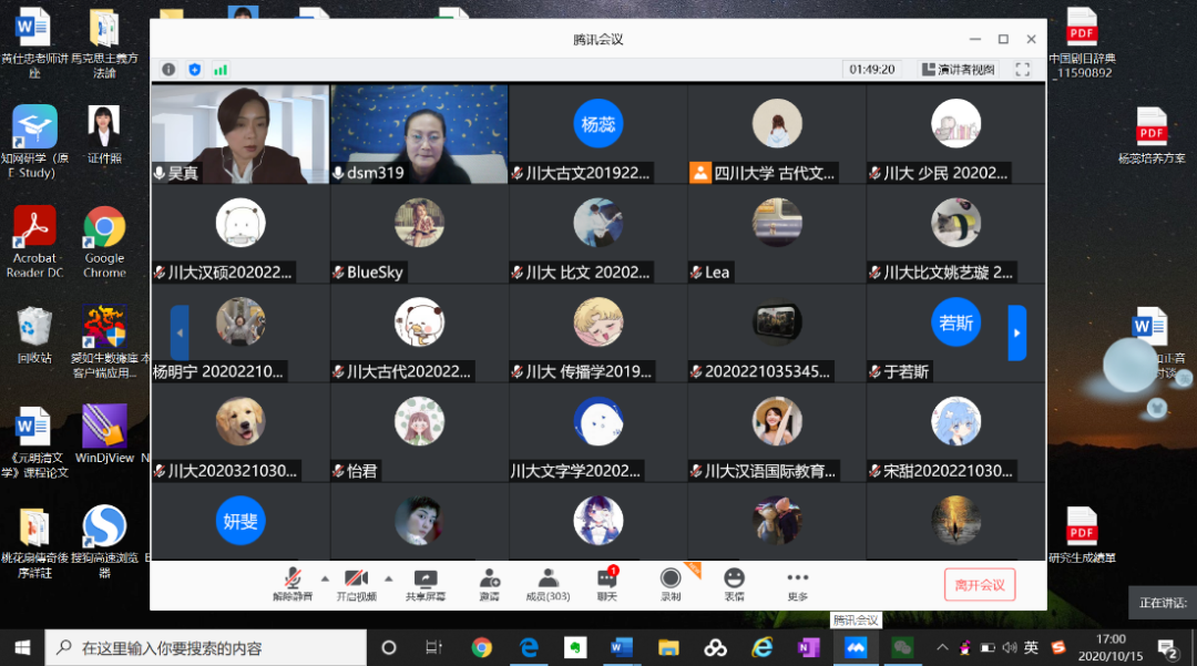 2020年10月15日15:30,中国人民大学文学院吴真教授应邀作题为“从说唱词话到白话小说的演进——以冯梦龙改编《云门传》为例”的主题讲座。讲座在腾讯会议平台顺利举办,我院丁淑梅教授任讲座主持人,院内外300余名师生在线参与。
