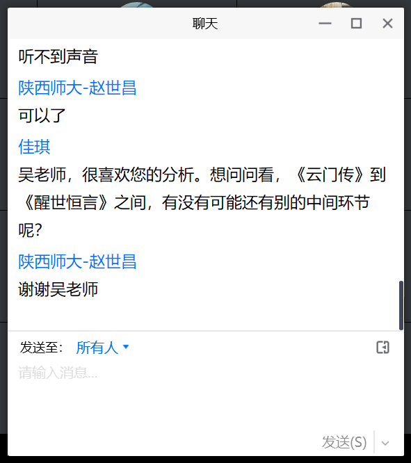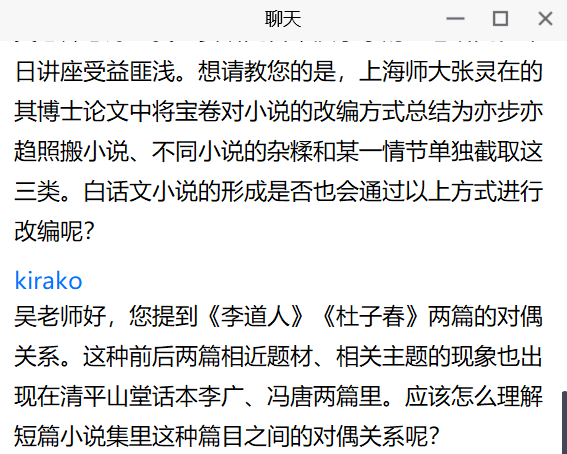 讲座互动环节,同学们积极地以文字的形式与吴真教授交流。吴真教授详细地回答了同学们提出的问题。最后,吴真教授提示同学们应当关注各作品之间的联动和递变,若有如《云门传》一类的更多的“失踪者”被发掘、被研究,中国文学史必然涌现出更多新质。