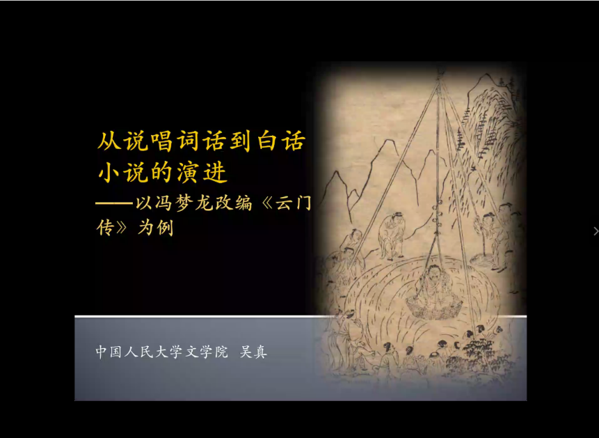 这堂讲座以线上的形式展开,吴真老师用生动的语言,详尽地向我们介绍了《云门传》的相关知识。作为一部说唱词话,冯梦龙虽然在大体上搬运了《云门传》原本,但是却加入了自己的改编,使其更具意味,以此体现出冯梦龙“文体自觉”的思想。在这堂讲座里,我收获颇丰,了解到了一些基础的文学性知识,比如老师讲到,《云门传》题目中的“传”,并不是一般的人物传记之意,而是特指散文韵文并用的文体;此外,老师还以问答式的方式,向大家抛出问题“《云门传》的叙事特点之一,也就是完全对位的复调式,作者为什么要这么机械地重复?”这是冯改编本留下的最大谜团。之后老师从几个方面给出了她的解答,对我们很具启发性。吴真老师对学术的严谨,对原典的细读,对问题的深入挖掘,都是我们研究生阶段非常需要拥有的治学态度。