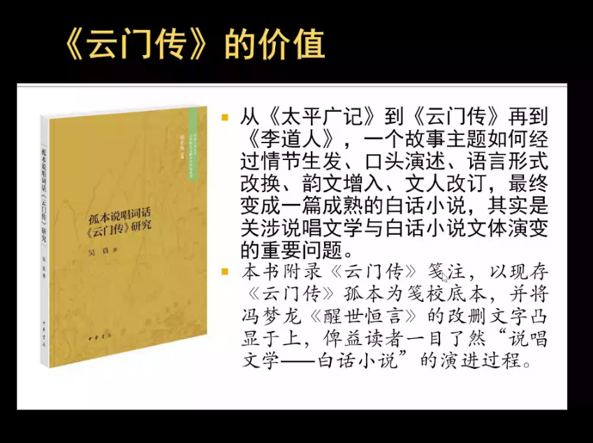 吴真教授《从说唱词话到白话小说的演进——以冯梦龙改编<云门传>为例》讲座以孤本文献《云门传》为中心,剖析了《太平广记》到《云门传》再到《李道人独步云门》的文体递变现象,展现了将《云门传》通过语体改换、叙事方式变化等方式改置成白话小说的路径,这具有重要的学术意义。其次,吴真老师《云门传》研究展现了一个完整的研究路径,对文献的敏感、对底本的摸索、对故事源流的分析、对文本细节的把握、对文本现象的高度凝练、对逻辑规律的学理归纳,都是极具有方法论指导意义的。通过对《云门传》和《李道人独步云门》的关系的阐析,足以管窥说唱文学对白话小说的滋养作用,这打开了我们更宽阔的视野,具有重大的启发意义。