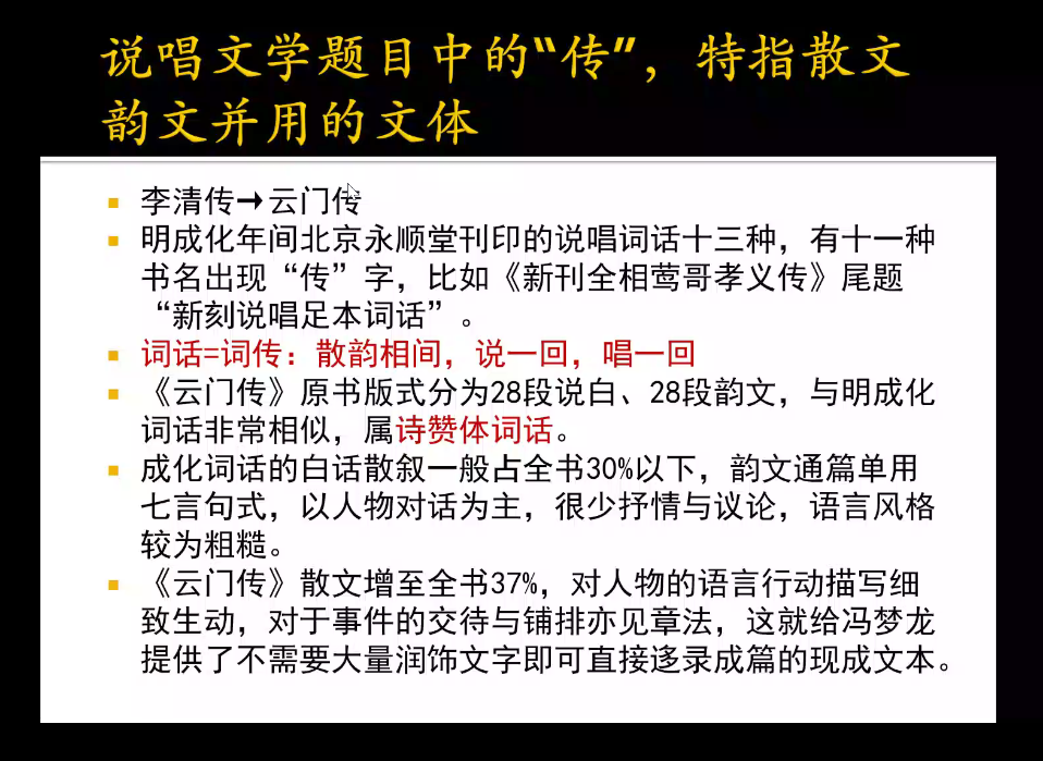 首先是对题名“传”的阐析:《太平广记》“李清传”为主人公的生平小传,而《云门传》为韵散相间的说唱文体,实乃元明说唱词话的特定称谓。吴真教授介绍到,早在元代,“词话”和“词传”就已是同义词了,这种现象并延续到了明成化说唱词话。