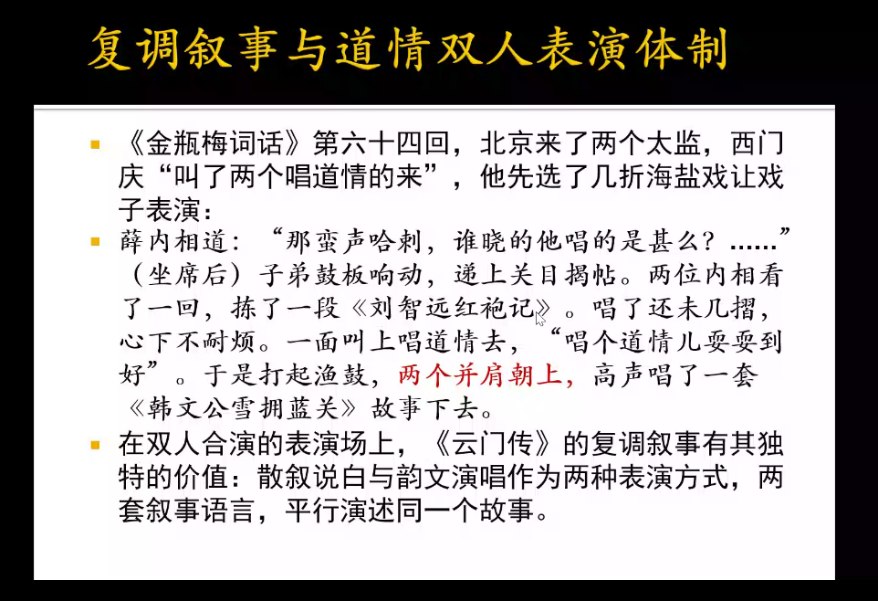 其次,吴真教授向同学们介绍并分析了《云门传》叙事中完全对位的复调现象。同样一个情节单元,散文、韵文重复讲述、完全对称。作者将文言小说《太平广记》改换为白话说唱时,出于什么考虑采用这种奇特的复调叙事?吴真老师通过《云门传》老瞽者唱道情的文本描写和《云门传》的内容判断,推定《云门传》的性质是宣扬道教的道情词话。其次,吴真教授从社会史出发,分析了李清故事之所以引起《云门传》作者改编兴趣的缘由,通过分析明代青州地方已有崇拜李清的香火祭祀和明代市民阶层求财求仙的时代主题,展现嘉靖年间李清信仰由虚入实的社会现象。解读文本复调叙事特征最为关键的钥匙在于《金瓶梅词话》,记载了道情双人表演形式。由此可以推定,当时北方存在着二人同台的道情表演。吴真教授在其专题论文中总结其叙事复调形式的形成原因和作用意义:“散叙说白与韵文演唱作为两种表演方式,两套叙事语言,平行演述同一个故事。说白的艺人发挥‘说书’的叙事专长,吟唱的艺人则侧重渲染抒情……同义反复却有它独特的宣教功能”,由此解答了复调现象的原因及作用。