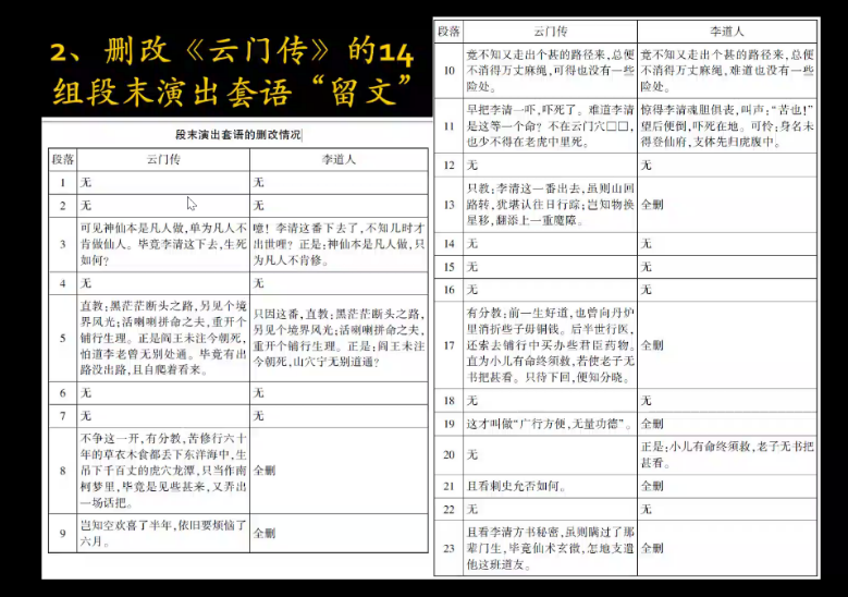 在讨论了上述的“加法”之后,吴真教授讲解了《云门传》中的“减法”:演出套语的删减和改装。吴真教授指出,《李道人独步云门》比《云门传》散文部分增加了2500多字,删减了近400字,主要分为两类:一是删去散文与韵文的呼应之处;二是删改《云门传》的14组段末演出套语“留文”。