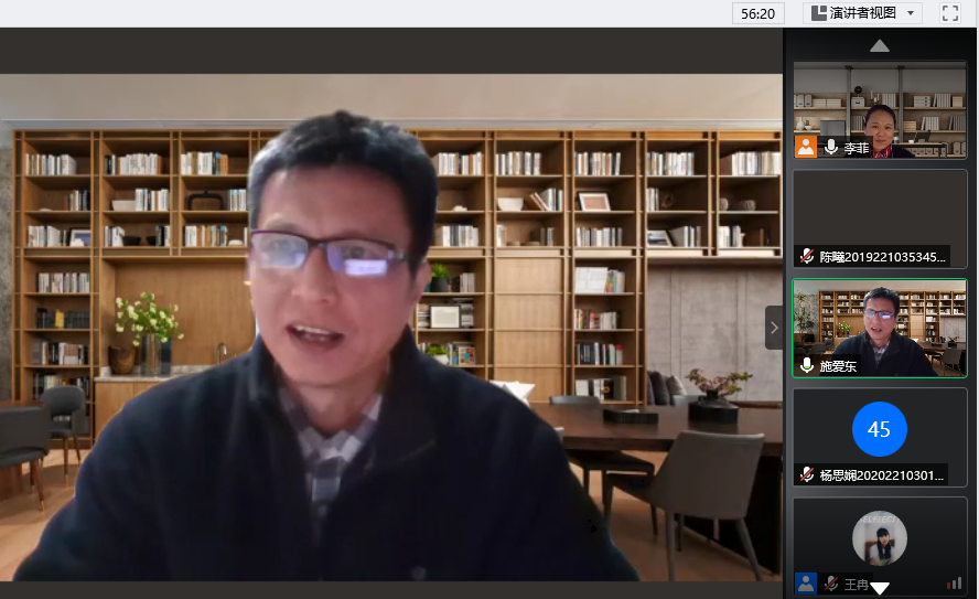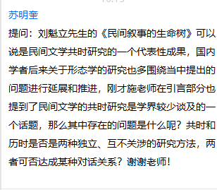讲座互动环节,同学们积极地以文字的形式与施爱东教授交流。施爱东教授详细地回答了同学们提出的问题。最后施爱东教授提示同学们共时研究和历时研究都是可行的思路方法,但具体到某一项研究中只能选择其一,任何研究都要设置自己的理论边界。