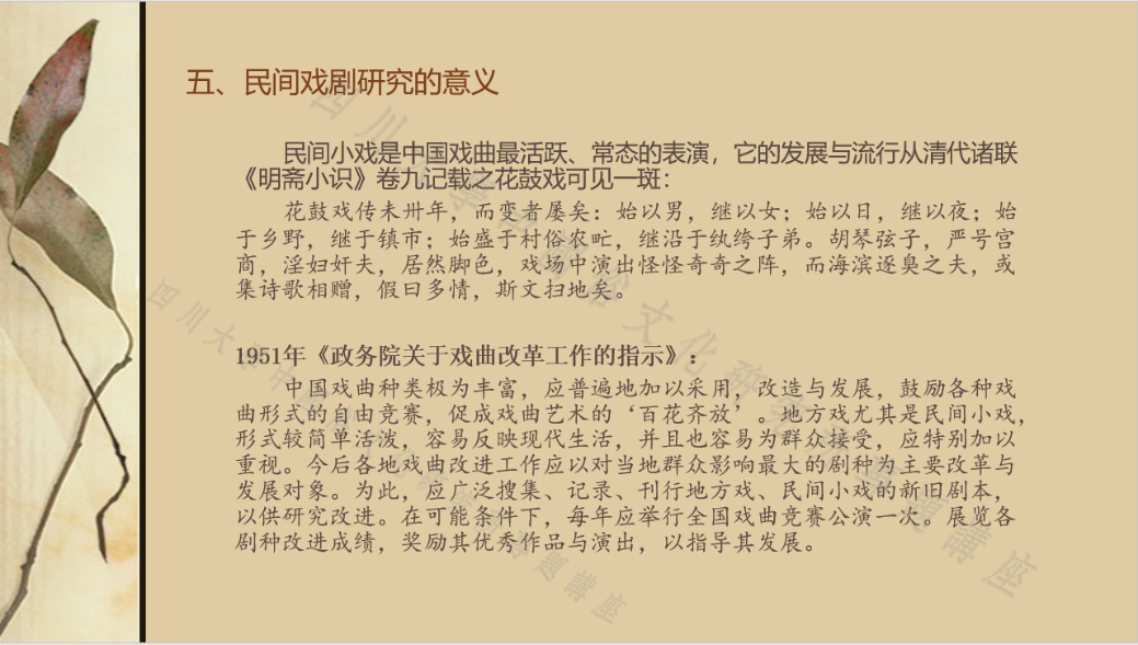 作为古代文学的学生,我更加关注的是民间小戏的传承和发展问题。之前也看过《论民间小戏的形态价值与生态意义》的论文,其实民间小戏在古代生存发展的空间是十分有限的,大部分活跃在民间社会。因为为文人士大夫所不耻,加上从艺艺人的文化水平有限,因此很少有戏本得以流传。虽然新中国成立后,国家对于民间小戏有扶持和鼓励,但很多小戏为了生存而不得不进行改编,从而变得面目全非。作为民间非物质文化遗产,我很希望能有人可以继续学习、保护、传承这门技艺,取其精华,弃其糟粕,长足发展。