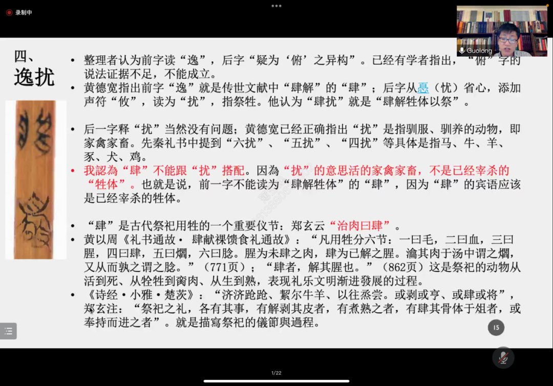 2021年12月14日20:00,美国佛罗里达大学艺术史系来国龙教授应邀为四川大学中国俗文化研究所师生作了题为“清华简《四告》中的祭祀仪节”的学术讲座。讲座在四川大学江安校区文科楼一区311会议室及腾讯会议线上平台同时举行,由四川大学中国俗文化研究所所长普慧(张弘)教授主持。我所雷汉卿教授、孙尚勇教授共同参与本次讲座的与谈。来自本校和北京师范大学、南京大学、武汉大学、西北师范大学等多所高校的五百余名师生通过网络共同参与了此次讲座。