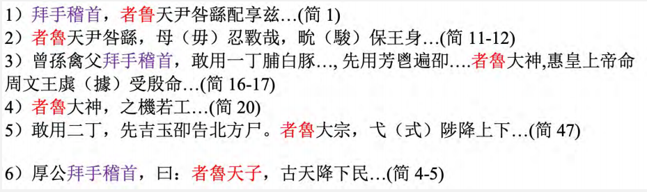 “者鲁”在《四告》中出现5次,《厚父》1次(如上所示)。我们通过分析该词在原文语境中的具体意义以及与其他词组的前后关系,可以得出以下两点基本结论:1.“者鲁”都是直接出现在所告的对象之前;2.在告之前,都有“拜手稽首”的礼仪动作。